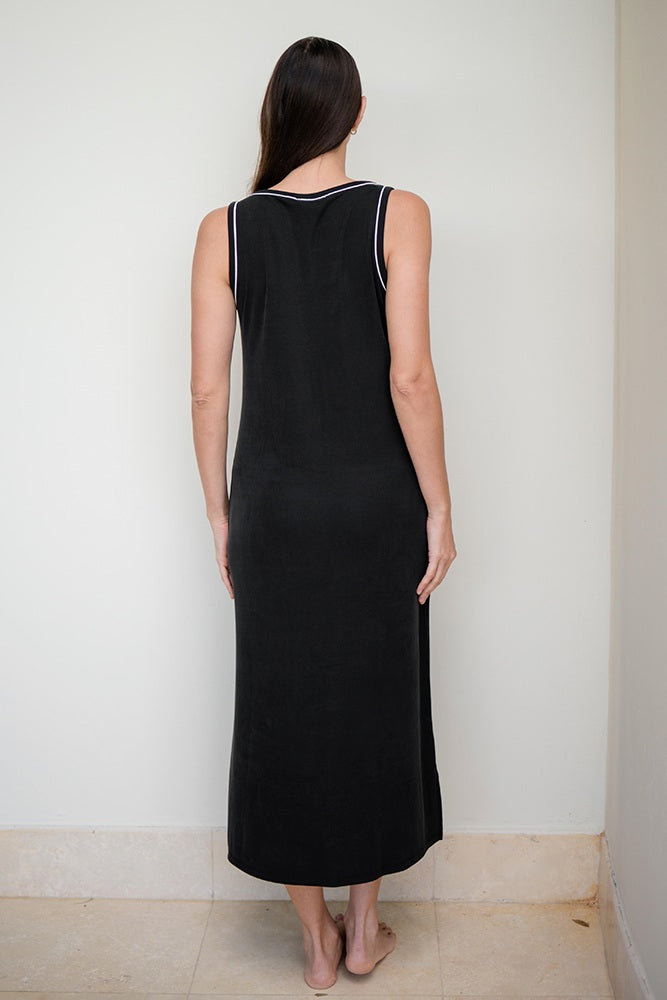 This sleeveless midi dress features a classic scoop neckline with a subtle contrast trim for a clean, feminine look. Made with a soft, fluid fabric and a relaxed fit, it drapes beautifully on the body and feels comfortable all day.